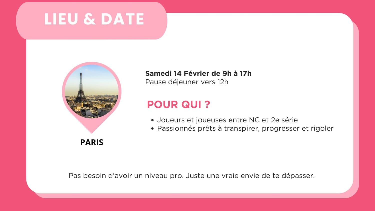 Tu repartiras avec plus de confiance, des clés concrètes pour tes prochains matchs, et une énergie nouvelle dans ton tennis.